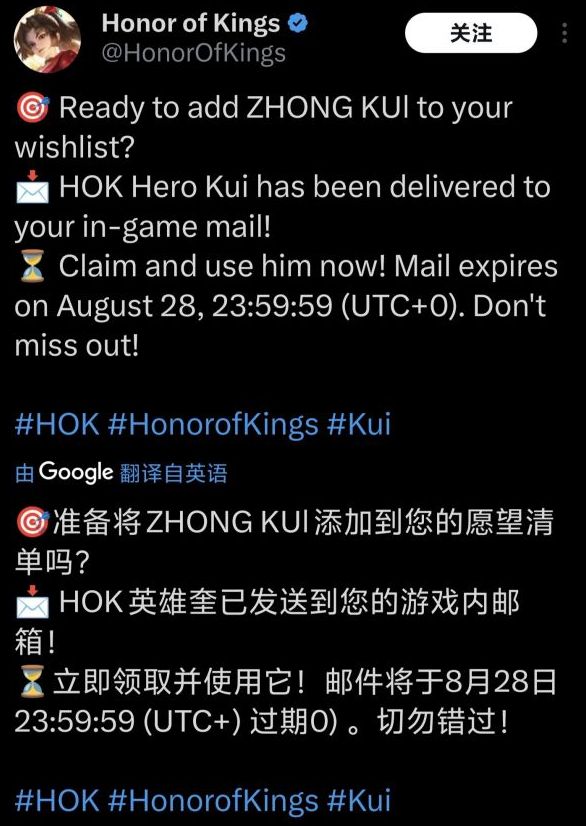 今年的科隆游戏展大家没等到黑猴DLC,倒是等来了新的黑猴宇宙成员黑神话钟馗,但钟馗其人传说和流传度远没有猴哥那么广,别说老外了咱们自己人都得查查资料。所以王者在本次放出的钟馗消息后在8月21日《王者荣耀》国际服向全体玩家限时发放了英雄钟馗以帮助