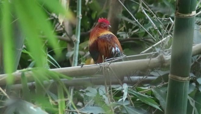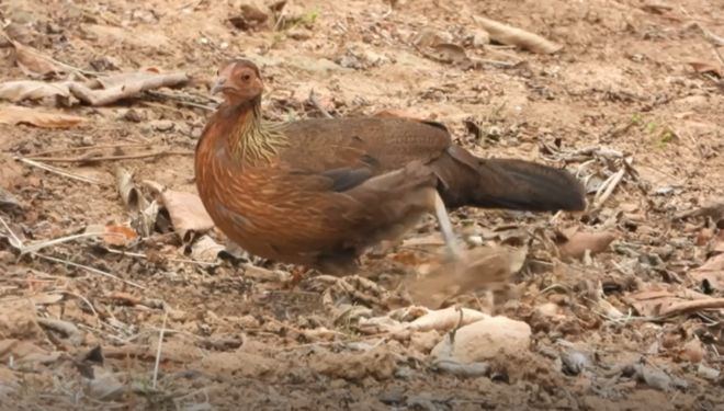 2021-2025年期间,我正好一直在云南省玉溪市新平县做野外观察。红原鸡的野外生境比较干热,属于我国北纬23度以南的热带地区。我拍过视频记录雌性红原鸡觅食的场景。作为野生鸟类,红原鸡具有非常强的飞行能力。
