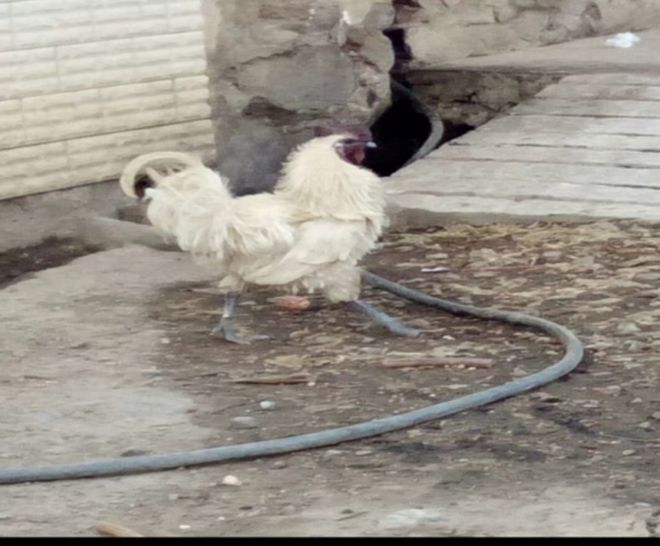 下面这只白色翻毛乌骨鸡,是著名的药用品种,主要分布在当地少数民族村落。其中白羽绿耳翻毛乌骨鸡的药用价值尤其高。